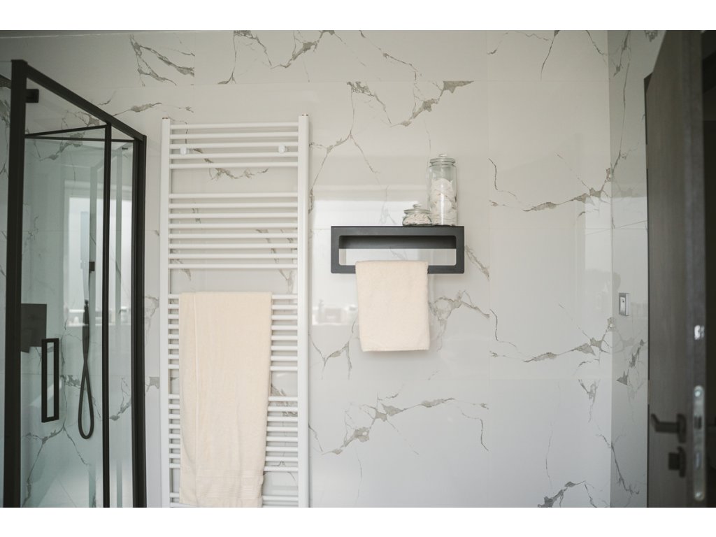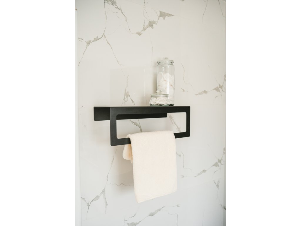 Jednoduchý a minimalisticky navržený kovový držák na ručníky do koupelny nebo šatny s odkládací plochou.